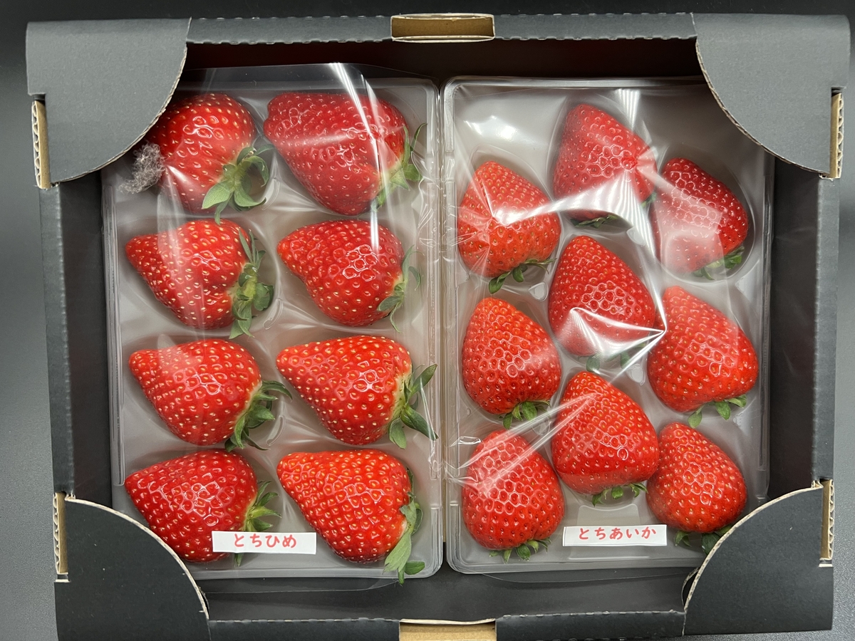 くまかわいちご園でとれるとちあいか、とちひめの中でも、粒が大きく色艶が良いものを厳選しました。中玉と大玉のサイズを1パックずつ(中玉パック260〜300g、大玉パック320〜400g)合計2パックお届けします。